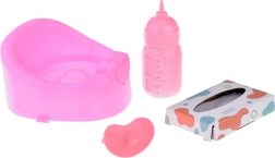 Комплектът включва биберон и други аксесоари, които помагат на децата да развиват грижовни умения. Играчката насърчава емпатия и отговорност чрез игрив начин на учене.