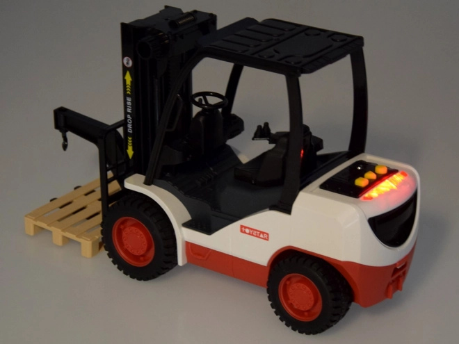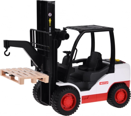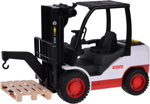 Комплектът съдържа мотокар и палета, което дава възможност на децата да играят на строителни и логистични операции. Мотокарът има гумени колела за лесно придвижване и регулируем подемен механизъм, който се управлява с помощта на манивела.
