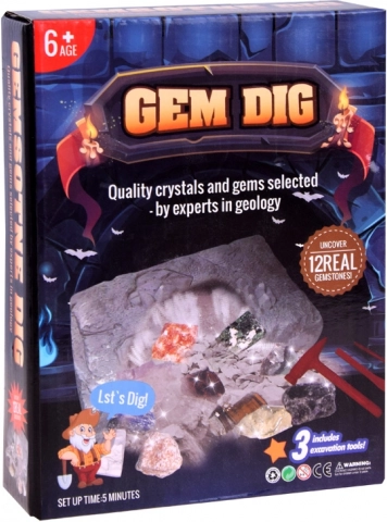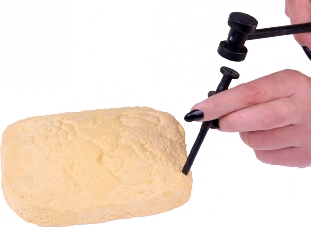 В опаковката има пластмасово чукче, длето и четка – идеални за внимателно изкопаване и почистване на откритите съкровища.