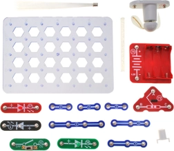 Основата с шестоъгълна решетка, цветните елементи и прегледното свързване улесняват първите експерименти с електроника дори за по-малки деца.