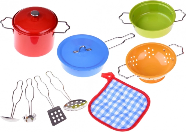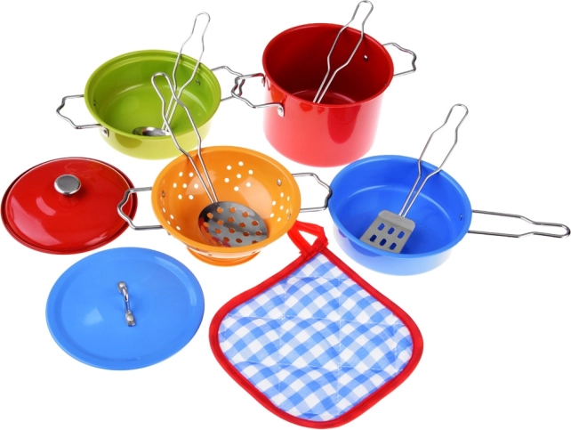 Пъстър метален сет за малки готвачи, който носи реалистична игра на готвене. Съдържа тенджери, тиган, цедка и прибори и е идеален за развиване на фантазията, фината моторика и ролевите игри в детската кухня.