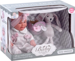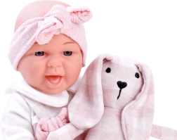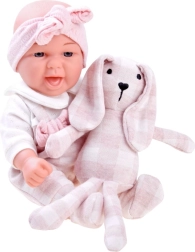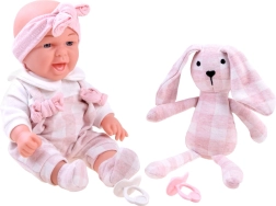 Тази сладка кукла – бебе е облечена в бяло‑розов комплект с мека лента за коса, блузка, съчетана с карирани къси панталонки, и бели чорапки. В комплекта ще намерите и мек плюшен зайчо с бродирани очички и носле и два биберона (бял и розов). Всичко е в нежна розово‑бяла палитра, която създава меко и чисто излъчване.