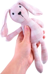 Сладък зайчо с бродирани детайли, ушит от същата материя като късите панталонки на куклата – чудесно съчетание и идеален за гушкане.