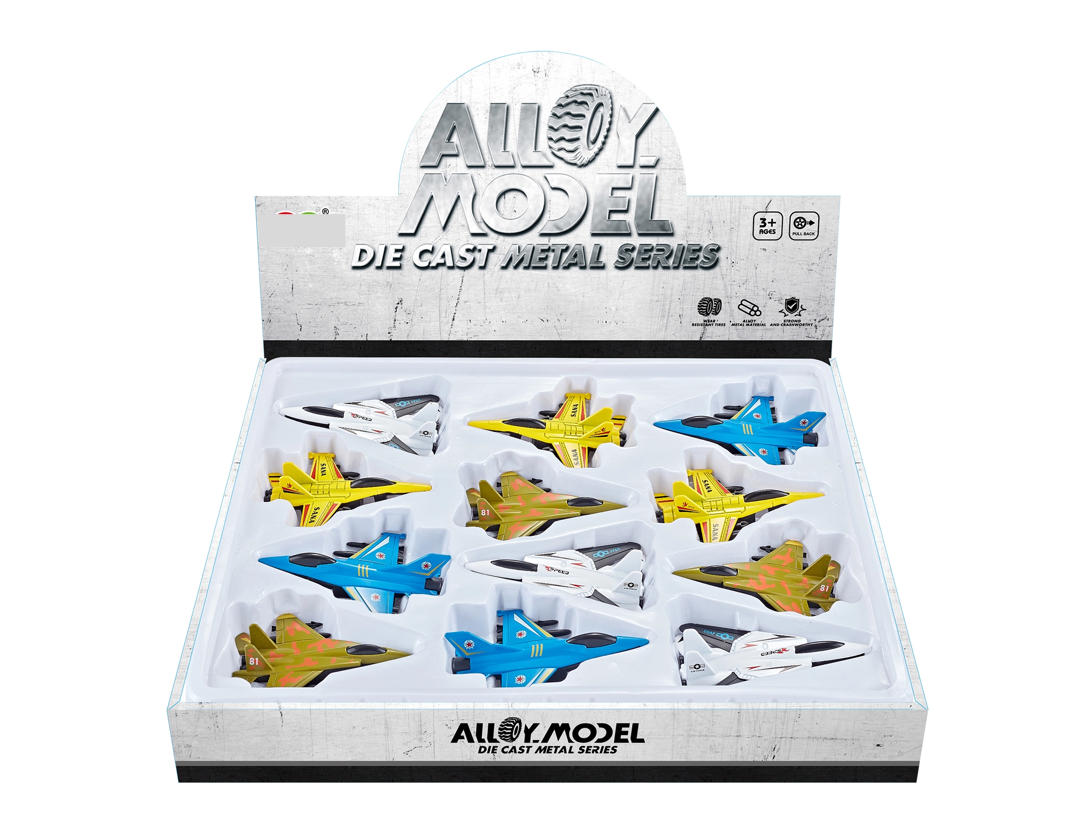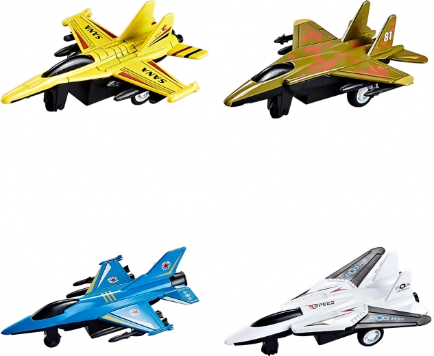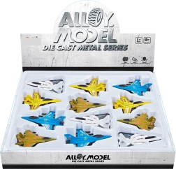 Метален изтребител с механизъм за издърпване назад и размери 10x7x4 см, предлага се в четири цветови варианта: бял, син, зелен и жълт.