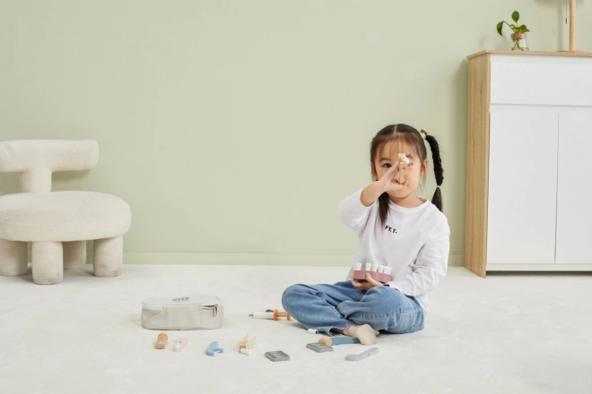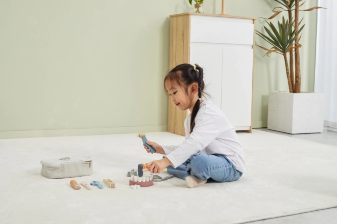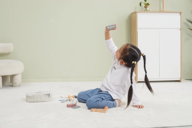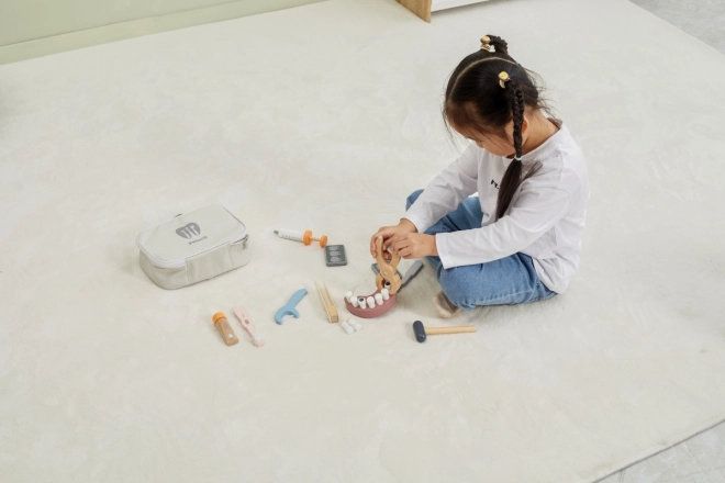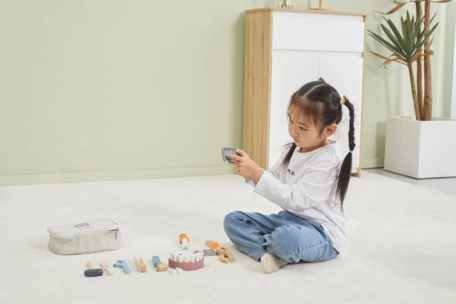 Всичко е събрано в здрава преносима чантичка, така че комплектът лесно се пренася и прибира. Качественото лакирано дърво и нетоксичните бои осигуряват безопасно и дълготрайно забавление. Идеален подарък за малки зъболекари и зъболекарки.