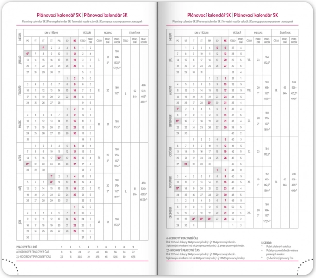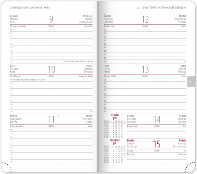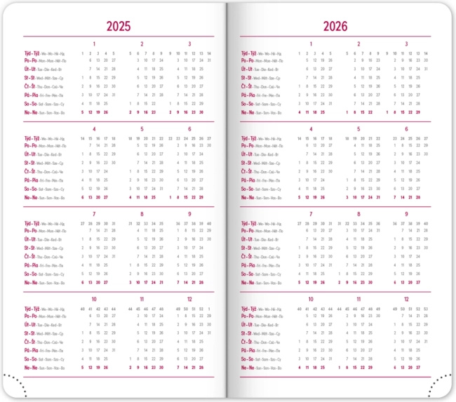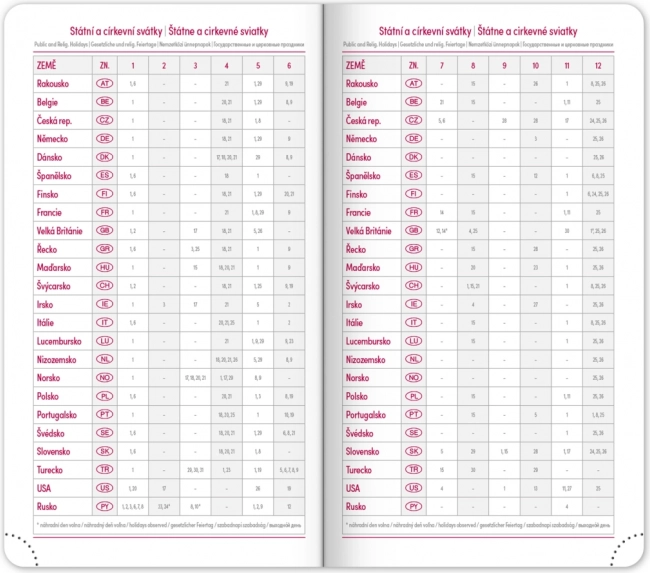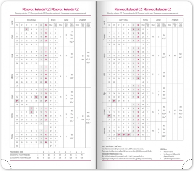 Дневникът предлага ясен седмичен layout с чешко‑словашки календар и допълнителни английски, немски, унгарски и руски. Налични са месечни и годишни планови календари, преглед на празниците, разширен списък с чешки имена и карти. Заоблените ъгли, текстилната лента‑отметка и перфорираните ъгълчета улесняват ежедневната употреба, а възможността за щамповане на годината и логото ще зарадва фирми и взискателни потребители.