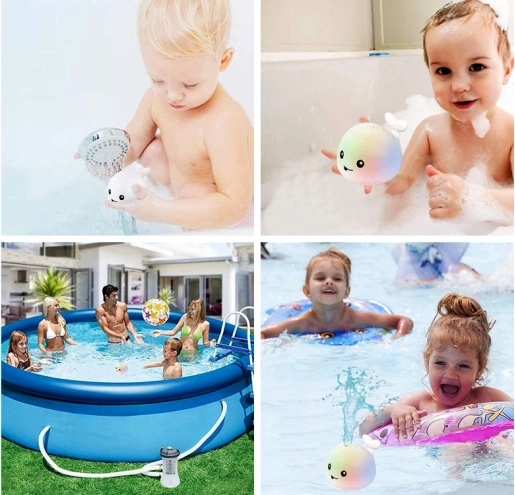След потапяне китът се активира автоматично и създава мини водоскок с променящи се цветове – моментално привлича вниманието и забавлява при всяко къпане.