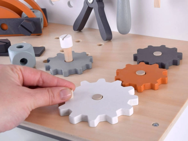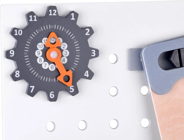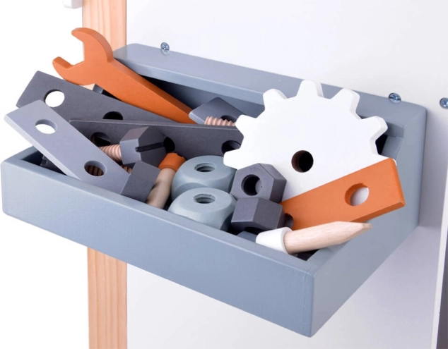 Масата е оборудвана с отделения за съхранение и перфорирана табла (pegboard), които учат децата как ефективно да организират своите инструменти и принадлежности.