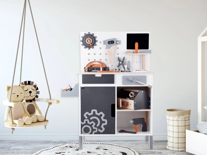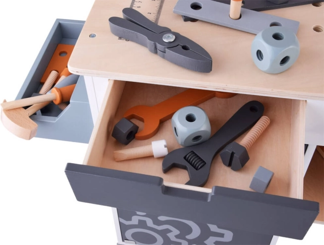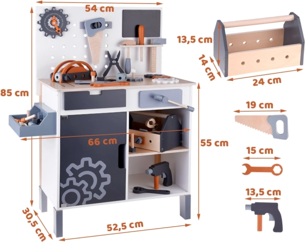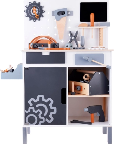 Дървената работна маса за деца е идеалната играчка за развитие на креативността и фината моторика. Благодарение на широката селекция от инструменти като трион, чук, отвертка и много други, децата могат да се потопят в света на „направи си сам“ игрите и симулацията на истинска работна среда.