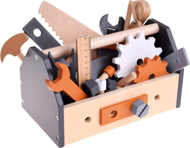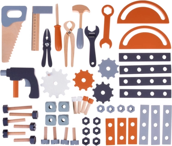 Комплектът съдържа широка гама инструменти като трион, бормашина, чук, ключове, отвертки и други – идеални за развиване на практични умения.