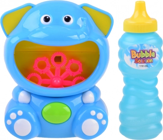 Налейте разтвора в отвора, натиснете бутона на коремчето на слона и гледайте как се завърта дискът и полита поток от дъгови балончета.