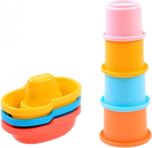 Стройте, преливайте и състезавайте се. Подреждащите се чашки с отвори и трите плаващи лодички стимулират въображението и забавните експерименти с вода.