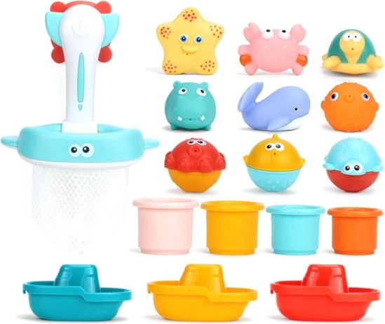 Комплектът предлага много възможности да забавлявате децата по време на къпане: загребвайте плаващите играчки с мрежичката, строете и преливайте вода с чашките, откривайте скривалища в разгъващите се топки и оставете гумените животинки да пръскат вода като мини фонтани. Благодарение на качествената пластмаса и гума играчките са леки, безопасни и идеални за вода.