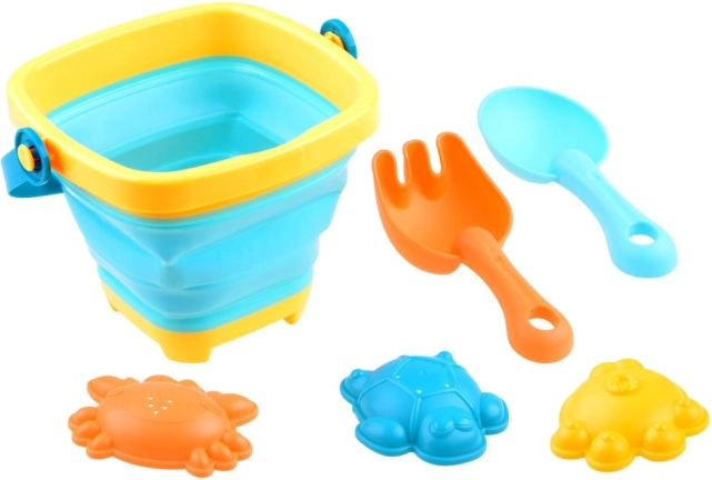Съдържа всичко необходимо за креативна игра в пясъка: сгъваема кофа, лопатка, гребло и три формички.