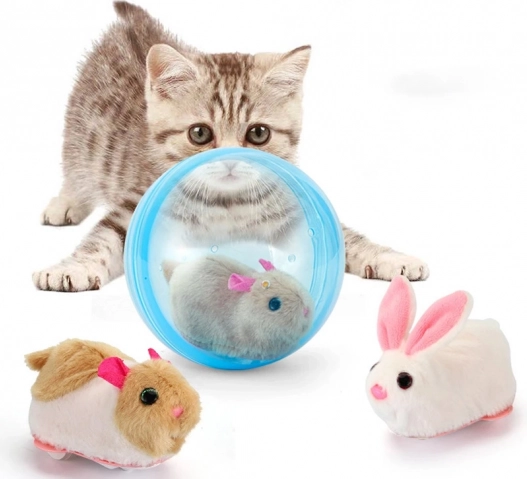 Хамстерчето в прозрачната синя топка се движи спонтанно, което естествено подтиква децата да наблюдават, а котките и кучетата – да играят.