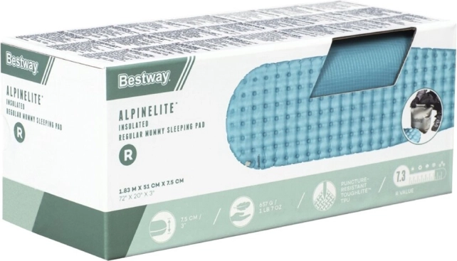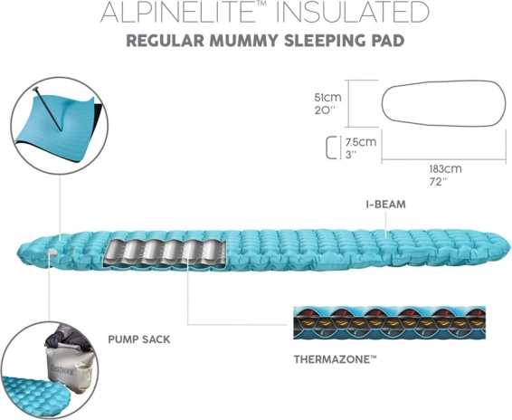Шалето AlpineLite Insulated Regular Mummy е идеален избор за тези, които искат да се насладят на комфорт при релакс на плажа, по време на къмпинг или нощувка навън в палатка. Надуването е лесно и бързо благодарение на иновативната система AirCinch™, при която е достатъчно да натиснете с длани въздушния чувал и шалето бързо се пълни с въздух. Комплектът е пълен, така че няма опасност да забравите помпа.