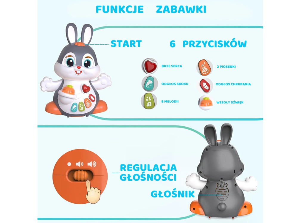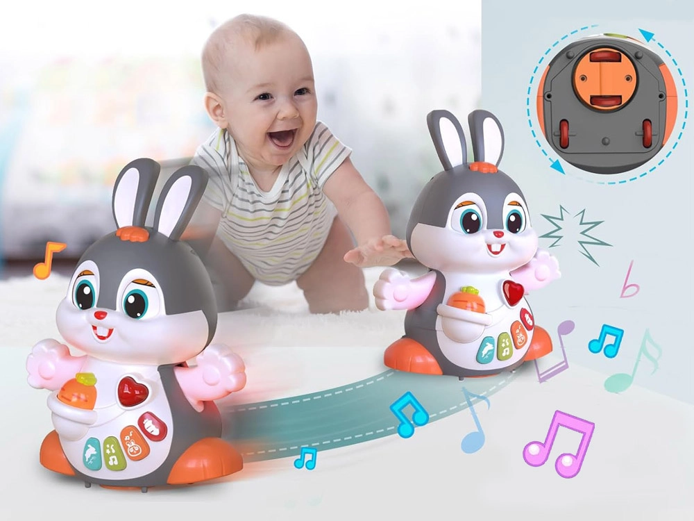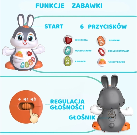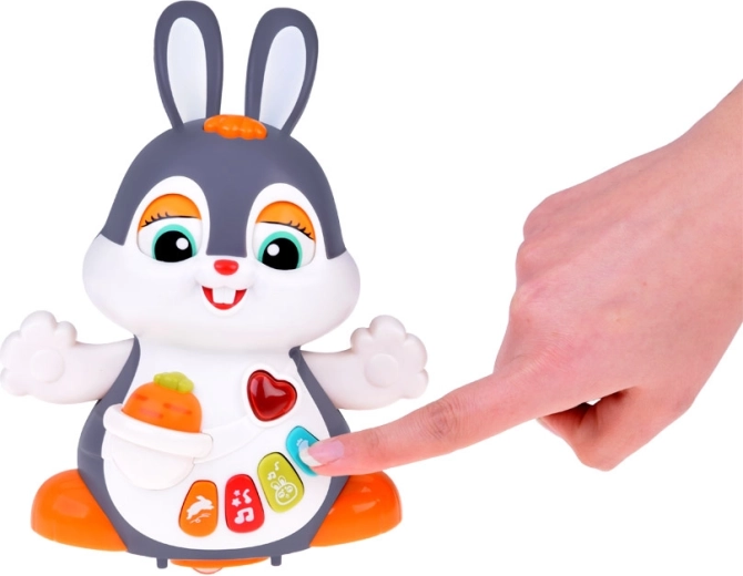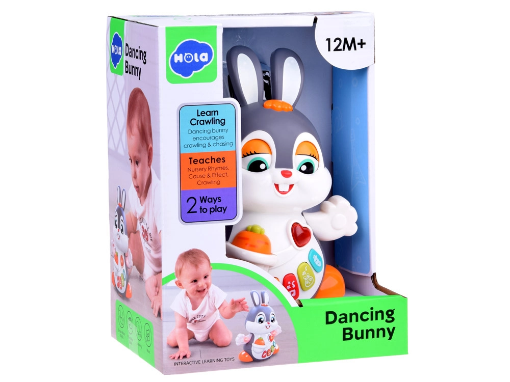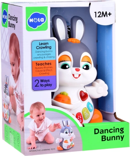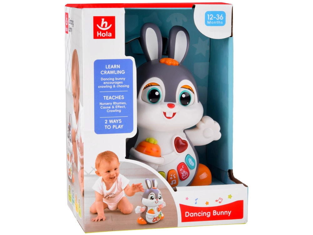 Интерактивното танцуващо зайче е чудесен спътник за първите стъпки и пълзене. Играчката може да се движи, да мига с очи и да свети в ритъма на музиката. Децата ще бъдат заинтригувани от цветните бутони с различни функции: мелодии, биене на сърце, звуци на подскачане и хрупане на морков – всичко това придружено от светлинни ефекти.