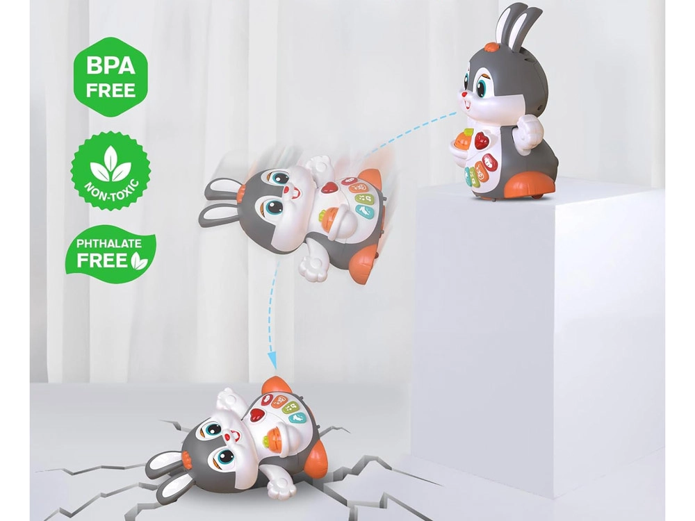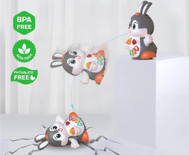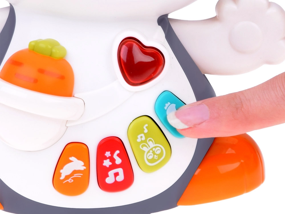 Цветните бутони активират различни мелодии и звуци (биене на сърце, подскачане, хрупане на морков), придружени от мигащи светлинки – идеално за сетивна стимулация.