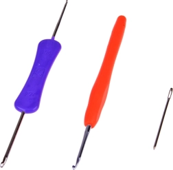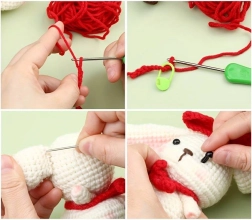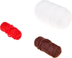 В опаковката ще откриете 3 памучни прежди (екрю, кафява, червена), пълнеж, кука 2,5 mm, двустранна кука, предпазна игла, очи, 5 предпазни маркера/игли и илюстрирано ръководство. Всичко е прибрано в цветна торбичка, така че лесно можете да вземете комплекта навсякъде със себе си.