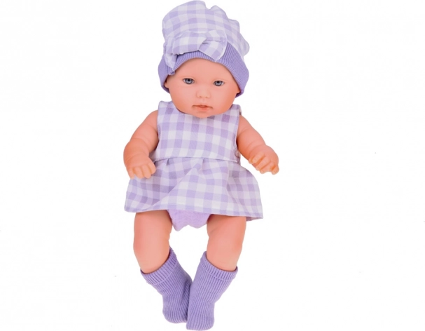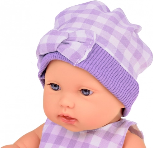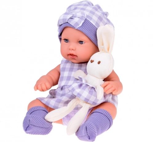 Комплектът е цветово обединен в елегантно сиво с нежно каре: куклата носи шапчица, рокличка и чорапки, плюшеният зайчо има поличка в същия стил, а текстилната кошничка красиво допълва всичко. Благодарение на подвижните крайници куклата лесно може да бъде поставена седнала или легнала, което разширява възможностите за игра.