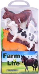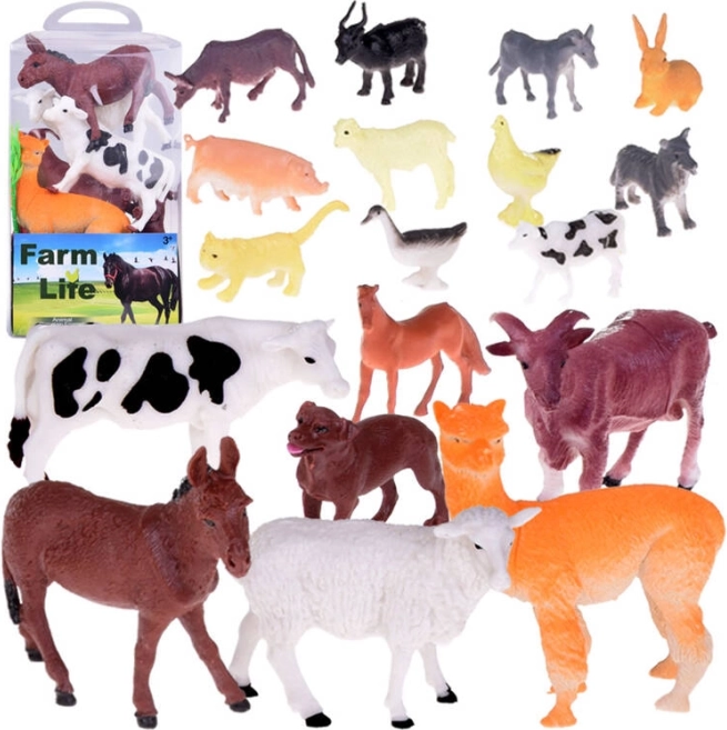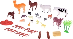 Крава, кон, куче, магаре, овца с агне, кози, алпака, прасе, бивол, котка, заек, патица и кокошка, допълнени от ограда, бала сено, трупи, храст и площ за игра.
