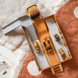 Открийте интерактивен строителен сет, който превръща детската стая в оживена строителна площадка. ТИР камионът с отварящ се контейнер след разгъване се превръща в подреден паркинг и работна зона. Вътре ще намерите изстрелваща рампа за колички, изтеглящи се стабилизатори за стабилна база и множество сценични елементи за реалистична игра.