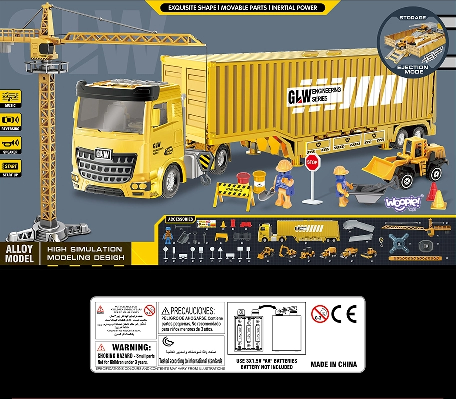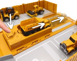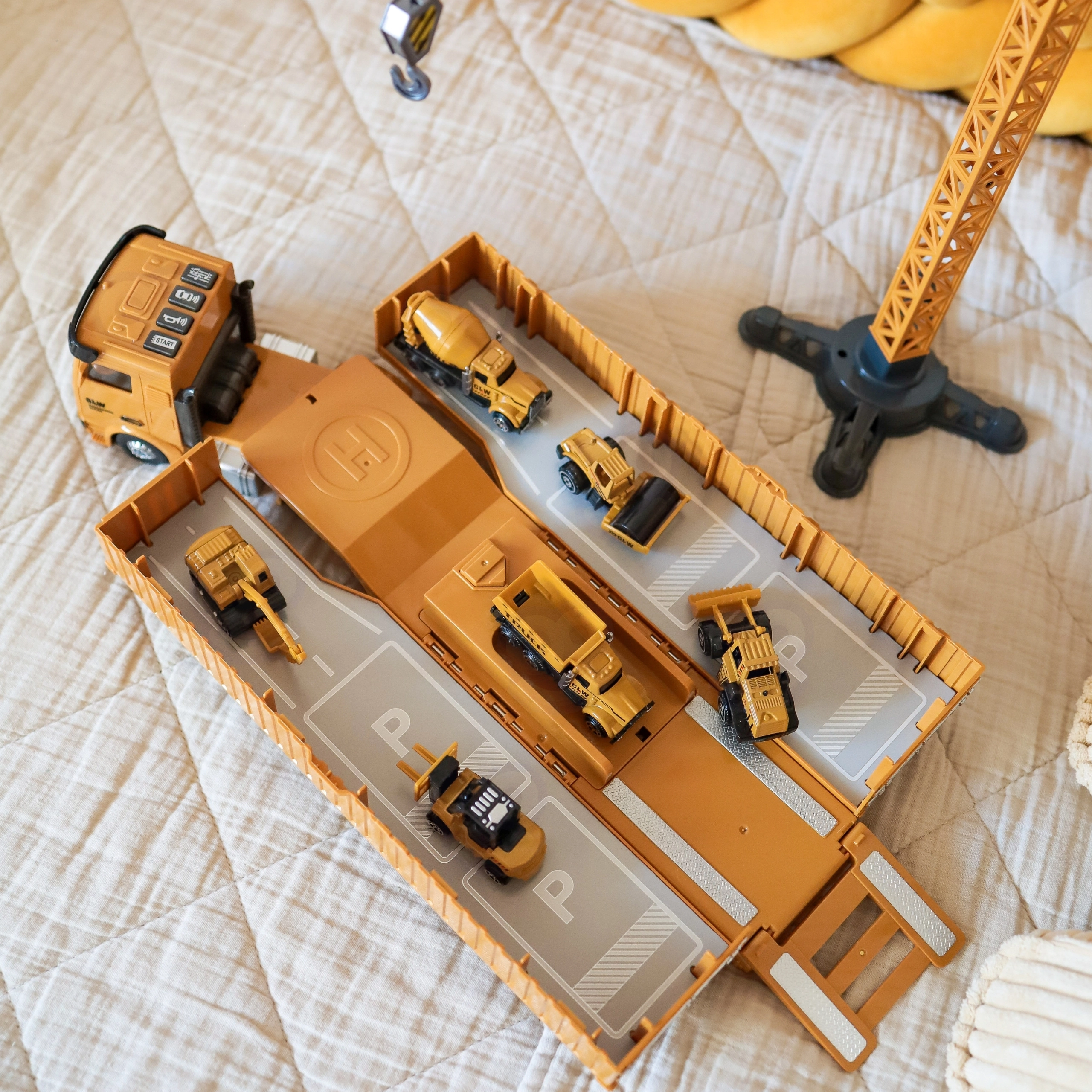 Включен е кулокран с въртене, въже и кука, който може да повдига аксесоари, както и 6 подвижни строителни машини (напр. багер, бетоновоз, самосвал). Фигурките на работници имат хващащи ръце за инструменти. Камионът предлага 4 интерактивни бутона с клаксон, звук при заден ход и мелодии, допълнени от мигащи червени светлини.