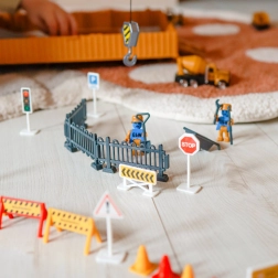За безопасна и поучителна игра не липсват пътни знаци, бариери, конуси и ограждения, за да се научат децата на основите на безопасността на пътя и на строежа. Сетът е идеален за креативна игра, развитие на фината моторика и въображението.