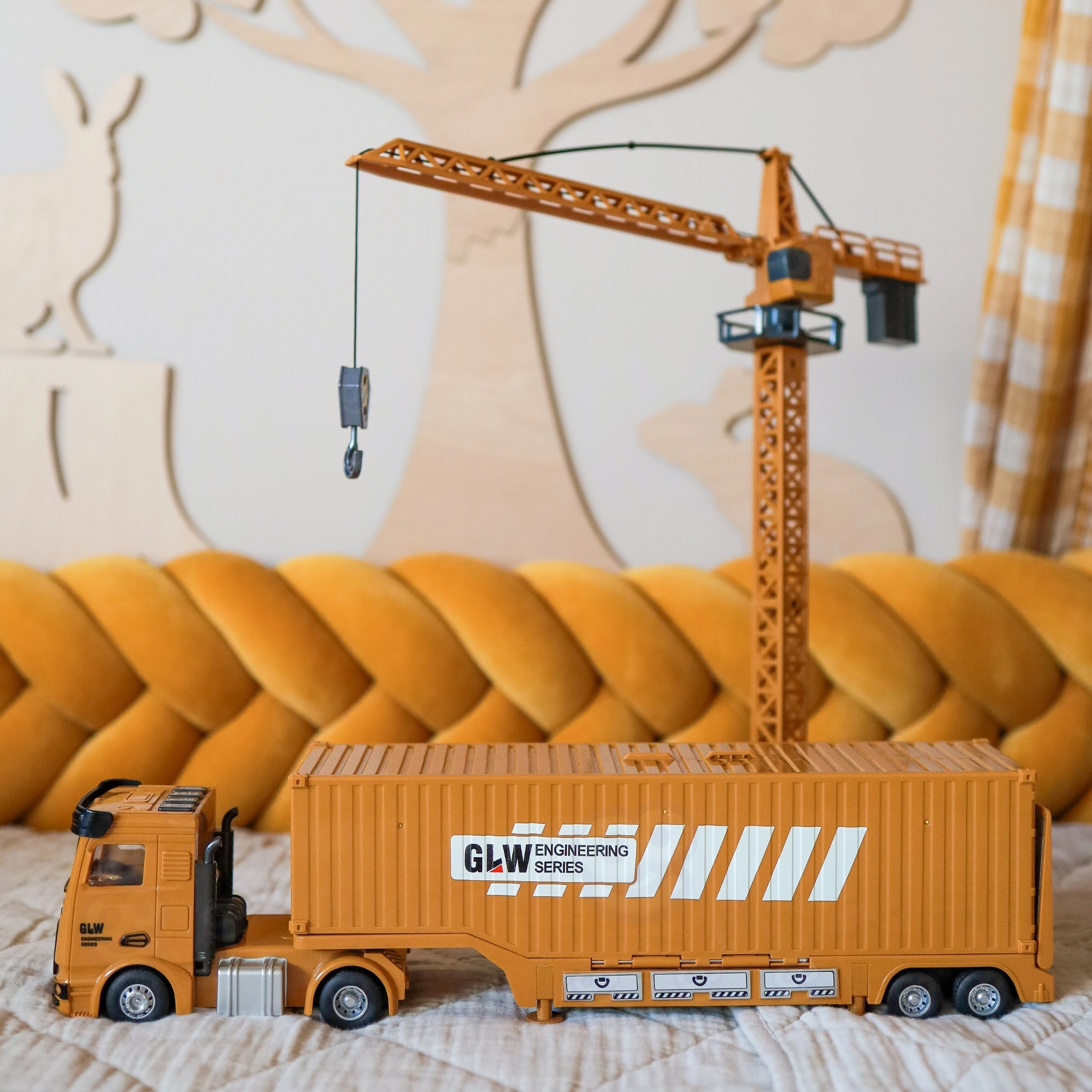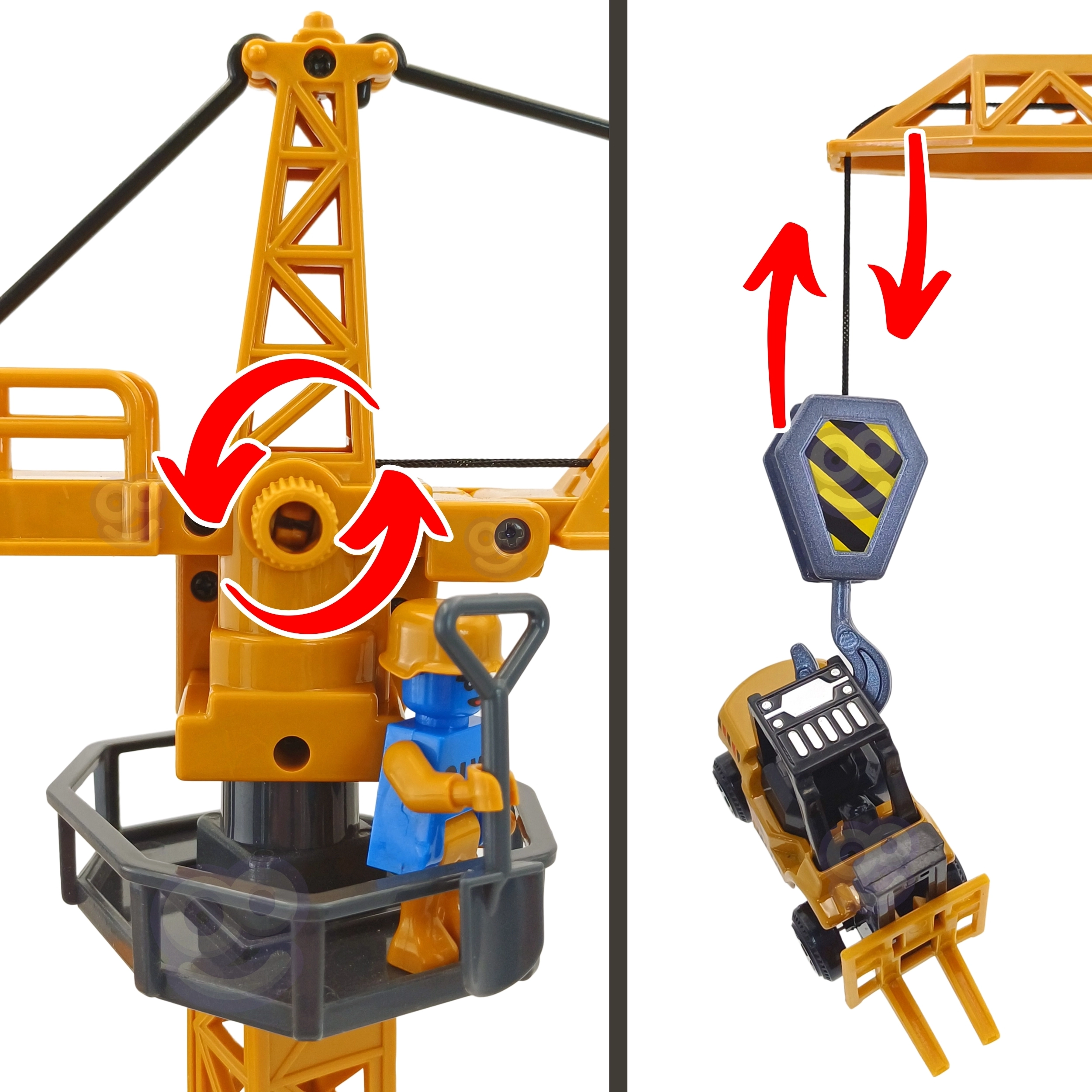 Високият кран повдига аксесоари, завърта се и създава реалистична строителна атмосфера. Идеален за товарене на контейнери и варели.