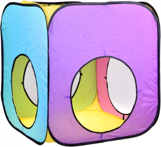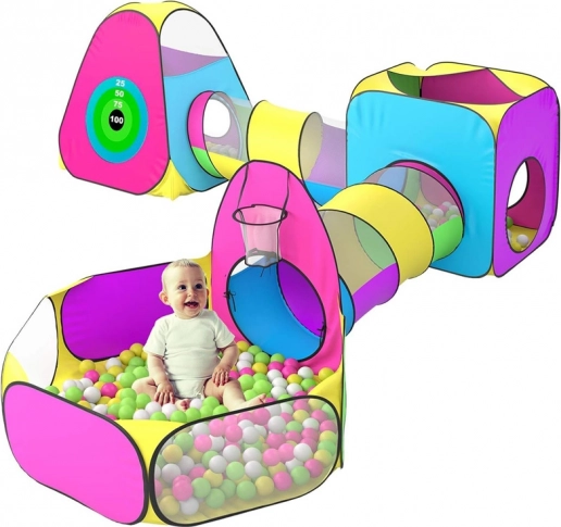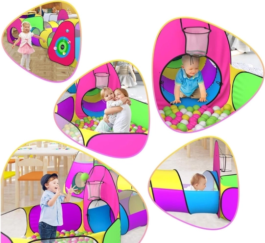 Всяка палатка предлага различни активности: триъгълна палатка с мишена и отвори за уцелване с топчета със сух цип, квадратна палатка с два входа и възможност за свързване на тунели и палатка – басейн/кошер, идеална за сух басейн с топчета (топчетата не са включени). Цветните панели и мрежестите секции подпомагат визуалната стимулация и наблюдението от възрастни.