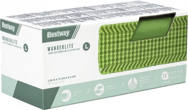Надуваемата постелка BESTWAY WanderLite Large е надежден спътник за къмпинг, туризъм и фестивали. Благодарение на щедрите размери 198 × 71 × 6,5 cm пасва отлично и на по-голям спален чувал и осигурява комфортна изолация и опора върху неравна повърхност. Комбинацията от материал ToughLite и ripstop найлон 70D предлага висока устойчивост на протриване и разкъсване при ниско тегло.