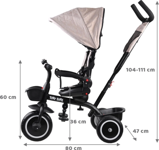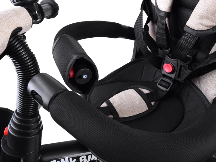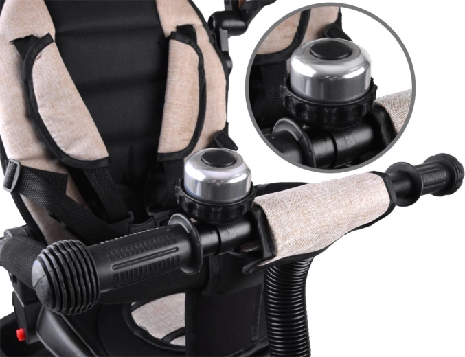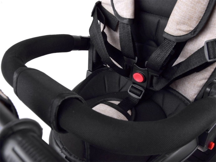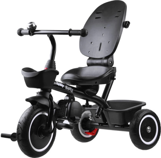 Тази многофункционална триколка 3-в-1 комбинира возило с родителско управление, удобен „кошара“ режим и самостоятелна триколка за първи карания. Въртящата се седалка позволява наблюдение на родителя или на посоката на движение, сенникът с вентилационна мрежа предпазва от слънце, вятър и лек дъжд и осигурява приятен климат. Петточковите колани, меката сваляща се бариера и подплатената тапицерия с лесна поддръжка се грижат за комфорт и безопасност.