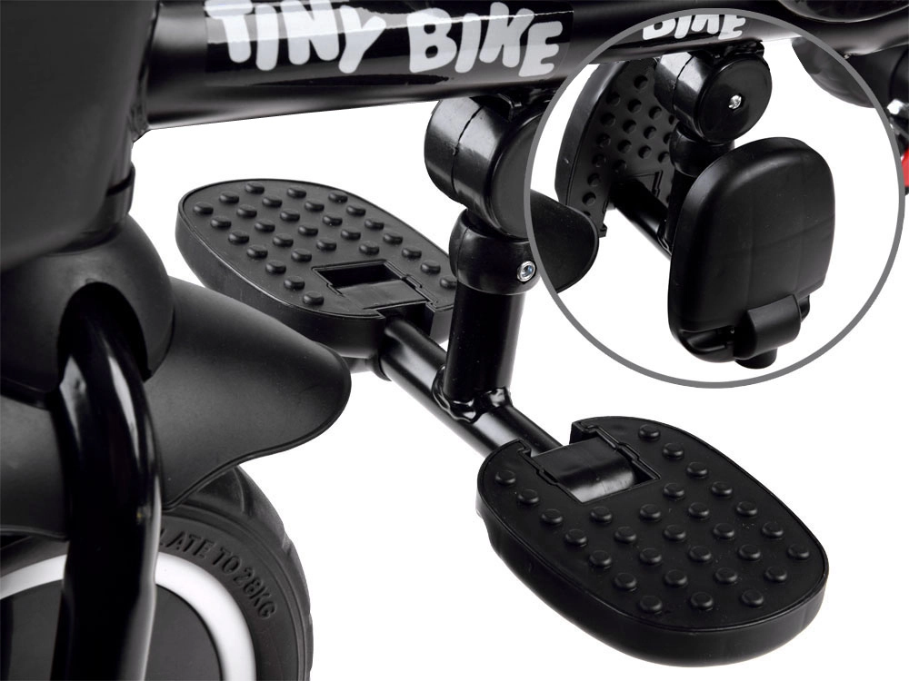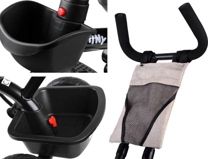 Родителите ще оценят регулируемата водеща щанга с удобен захват, двойните паркинг спирачки на задните колела и практичните места за съхранение: предна кошничка, заден голям кош и малка чанта за дреболии. Колелата от EVA пяна не изискват помпане и осигуряват тихо и стабилно возене. Сгъваемите степенки и педалите на предното колело улесняват прехода между режимите, така че триколката плавно расте с детето.