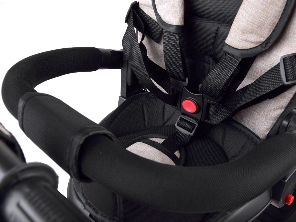 Седалката лесно се завърта по или обратно на посоката на движение. Петточковите колани, меката предпазна бариера и подплатената тапицерия осигуряват безопасност и комфорт от първите возения.
