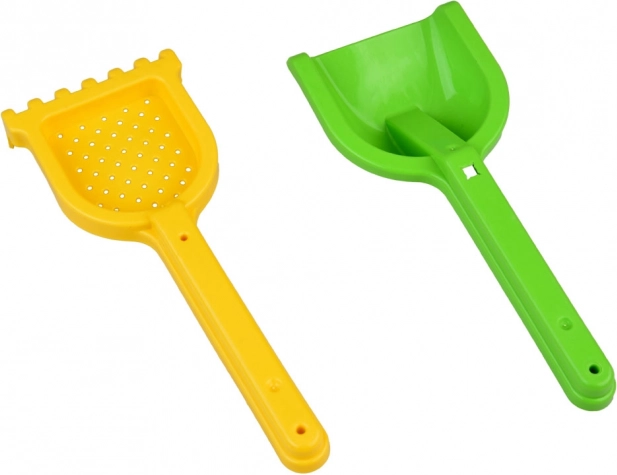 Включва гребло, лопатка и форми за безкрайно строене и творчество в пясъка.