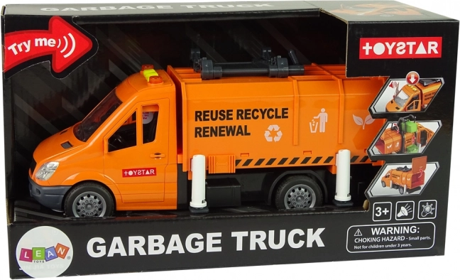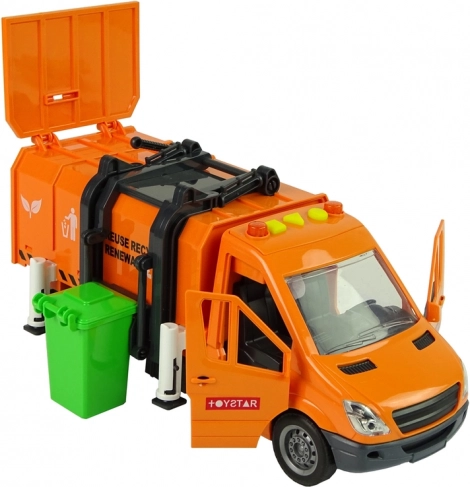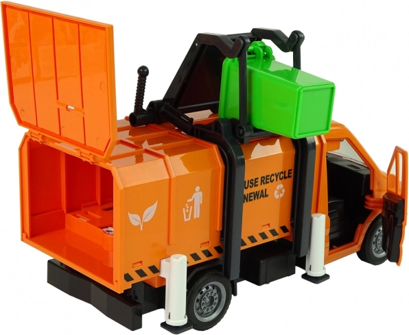 Оранжевият боклукчийски камион правдоподобно наподобява истинско превозно средство за събиране на отпадъци и превръща детската стая в малък рециклиращ център. Благодарение на фрикционното задвижване е достатъчно да побутнете камиона и той тръгва сам. Отваряемият контейнер позволява лесно изсипване на „отпадъците“, докато страничният повдигач изсипва съдържанието на кофите директно в надстройката.
