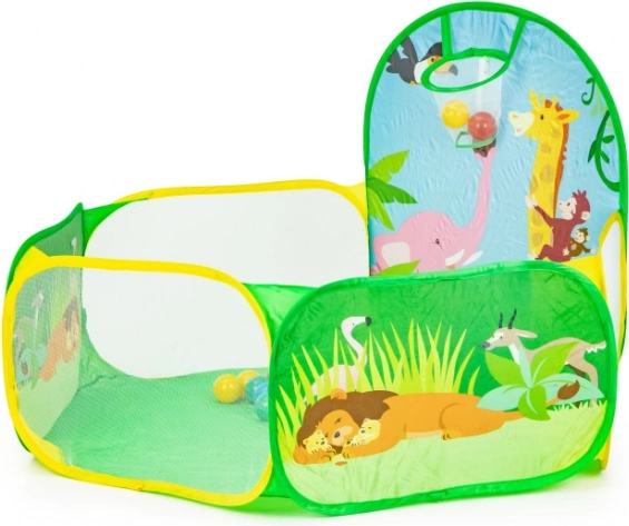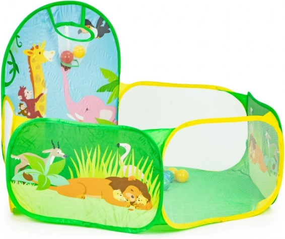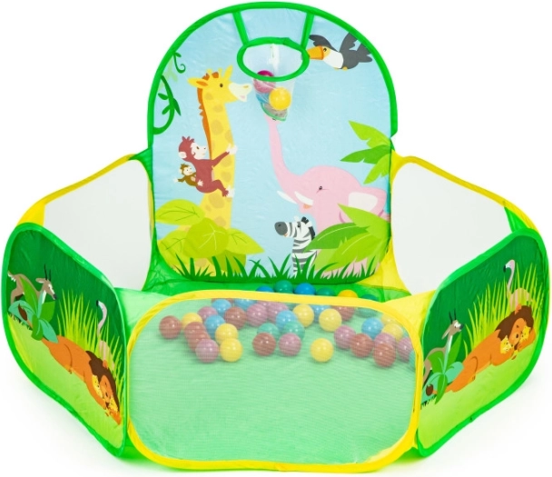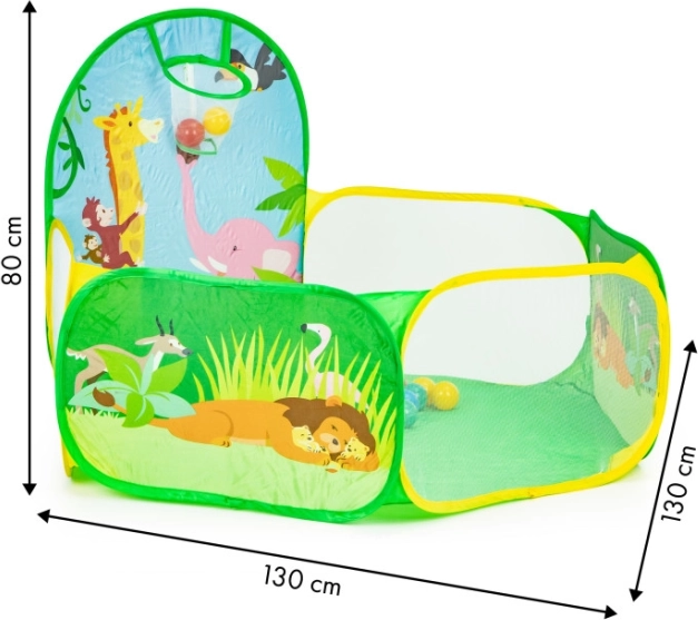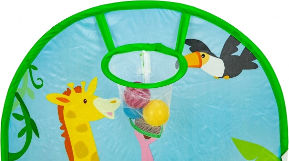 В комплекта са включени 50 пластмасови топчета (Ø 6 cm), които превръщат палатката в забавен сух басейн. Вграденият кош за хвърляне мотивира към движение, развива координацията и точността. Издръжливото дъно е готово за игра на закрито и на открито.