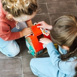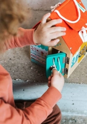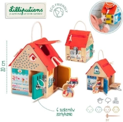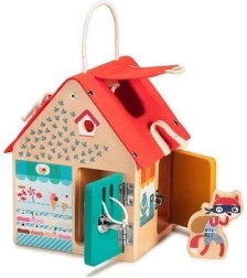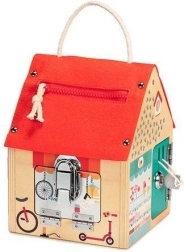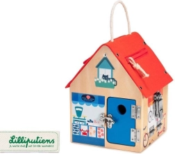 Тази качествено изработена къщичка от белгийската марка LILLIPUTIENS предлага на всяка страна и на покрива различна активност. Децата ще отварят и затварят вратички към различни „магазинчета“ (велосервиз, сладкарница, бижутерия, хранителни стоки) и ще изследват 6 вида закопчавания: ключ, плъзгаща резе, закопчалка, кукичка, цип и велкро. Текстилният покрив е здрав и закрепен с капси, а къщичката има и въжена дръжка за лесно пренасяне.