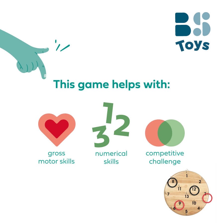 Забавна игра за сръчност за деца от 6 години и възрастни, в която играчите хвърлят рингове към куки на дървена мишена и броят точки. Подпомага моториката, състезателния дух и числовите умения. Идеална за градината, у дома и за партита – чудесна алтернатива на игрите без екрани.