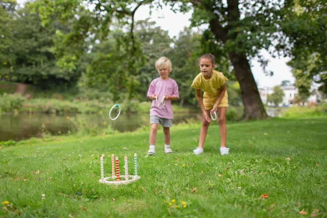 Тази традиционна игра с дървена основа и цветни обръчи е идеална за външни и вътрешни пространства. Изпробвайте уменията си в хвърляне на обръчи към цветни колчета и събирайте възможно най-висок резултат. Играта е забавна и предизвикателна, тъй като можете да регулирате разстоянието за хвърляне.