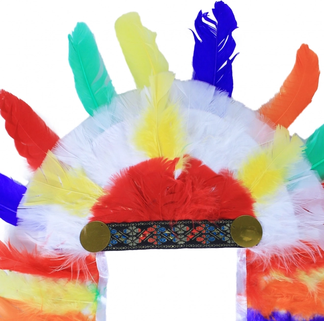 Пъстрите пера в червено, синьо, зелено и жълто създават забележим карнавален стил и подчертават атмосферата на индианския костюм.