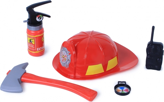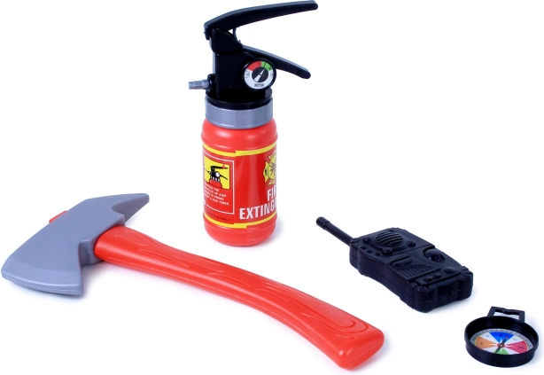 Този пожарникарски комплект е идеален за детски игри на герои. Включва яркочервена каска с значка, функционален воден пожарогасител, здрава пластмасова брадва, уоки-токи и компас. Така децата могат да тренират комуникация, координация и да развиват въображението си в безопасна среда.