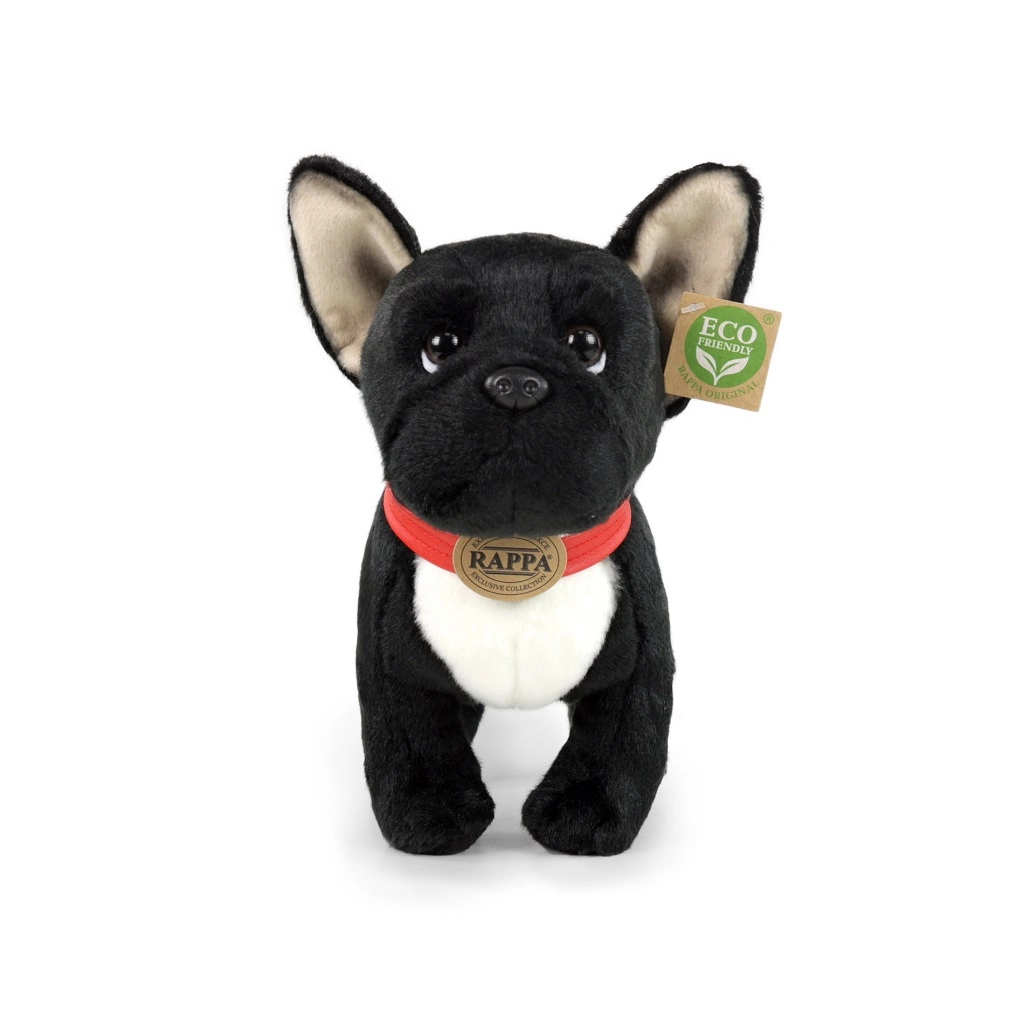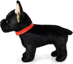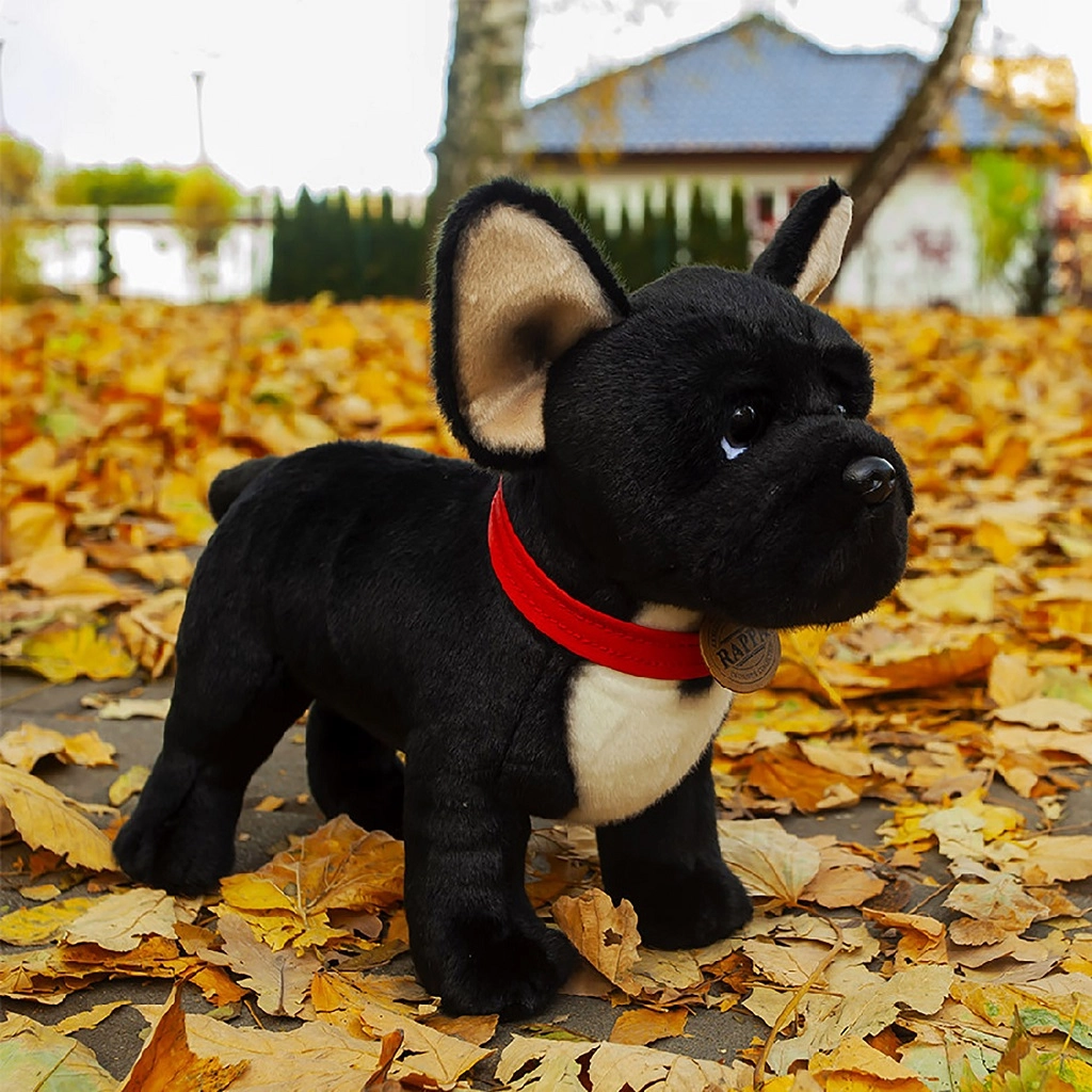 Това черно френско булдоче с червен нашийник се отличава с детайлно изработени черти и супер мек повърхностен слой, който направо приканва към гушкане. Благодарение на ръчната изработка изглежда много реалистично и ще стане любим спътник на децата още от раждането.