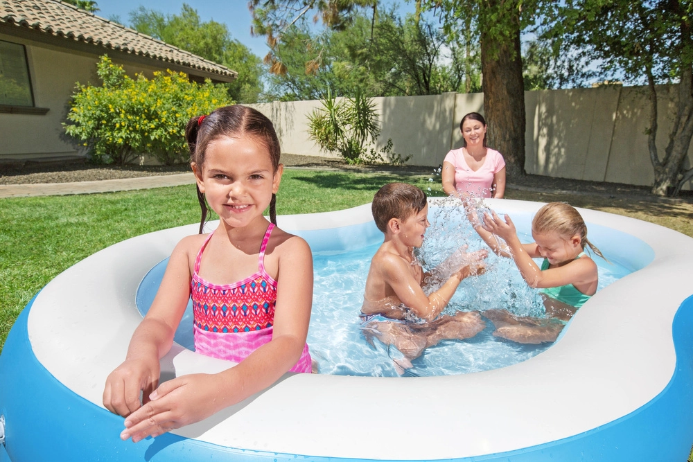 Обемът от 544 л е идеален за семейно освежаване в горещи дни – басейнът предлага достатъчно пространство за деца и родители. Благодарение на предпазните вентили въздухът не изтича и басейнът запазва формата си. В комплекта ще намерите и водоустойчива ремонтна лепенка, която може да се използва дори при напълнен басейн.