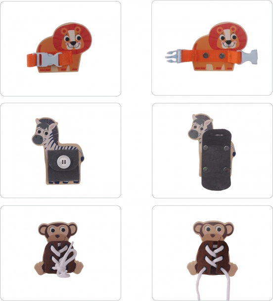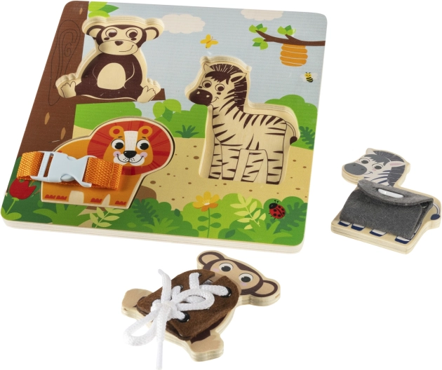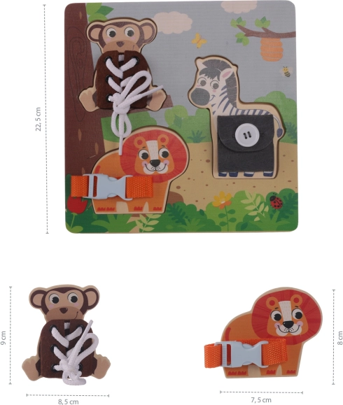 Този висококачествен дървен Монтесори пъзел представя на децата пъстър свят на сафари с любими животни като лъв, зебра и маймунка. Всеки елемент предлага различна задача – да се закопчае катарама, да се вържат връзки или да се закопчае копче – което естествено тренира самостоятелността и търпението.