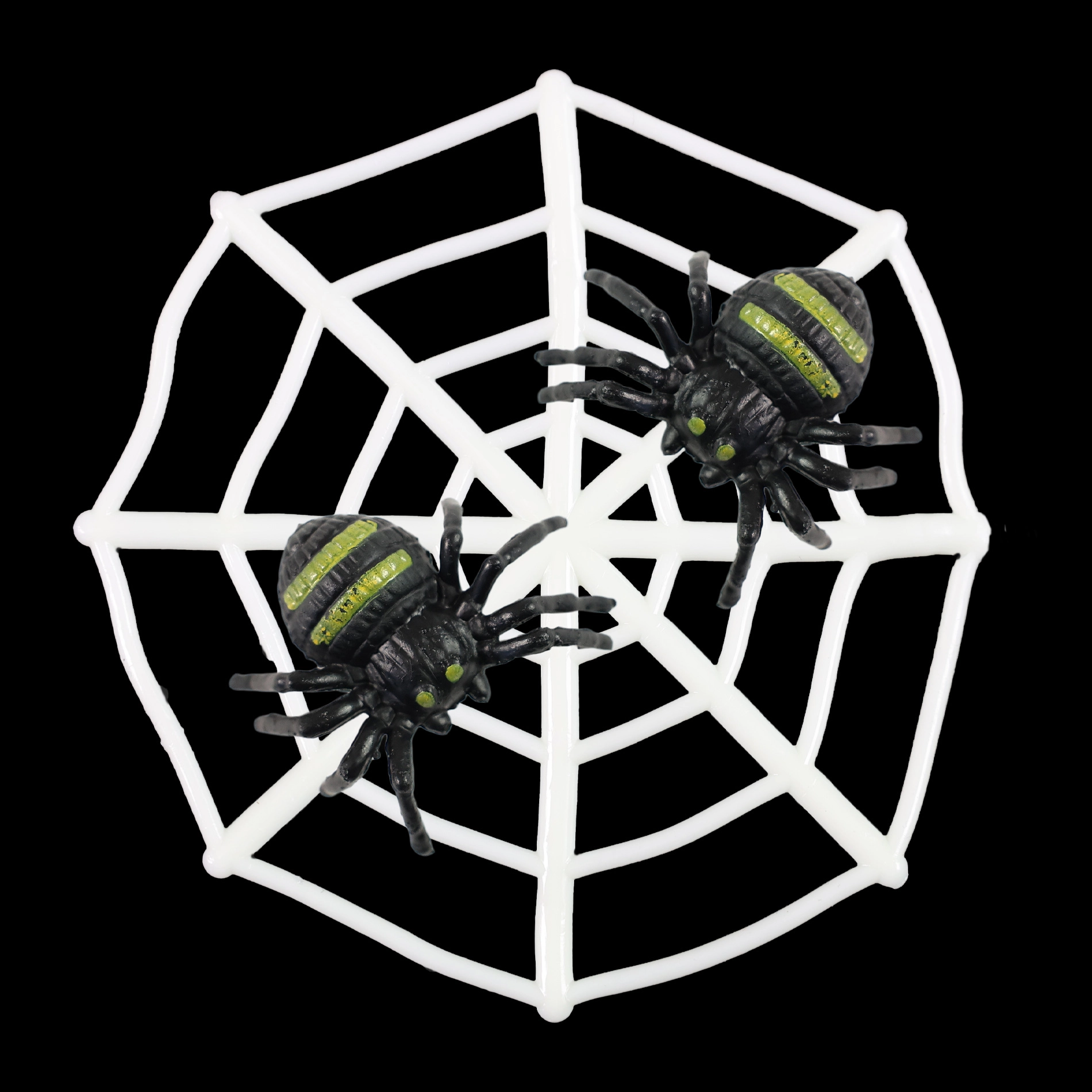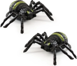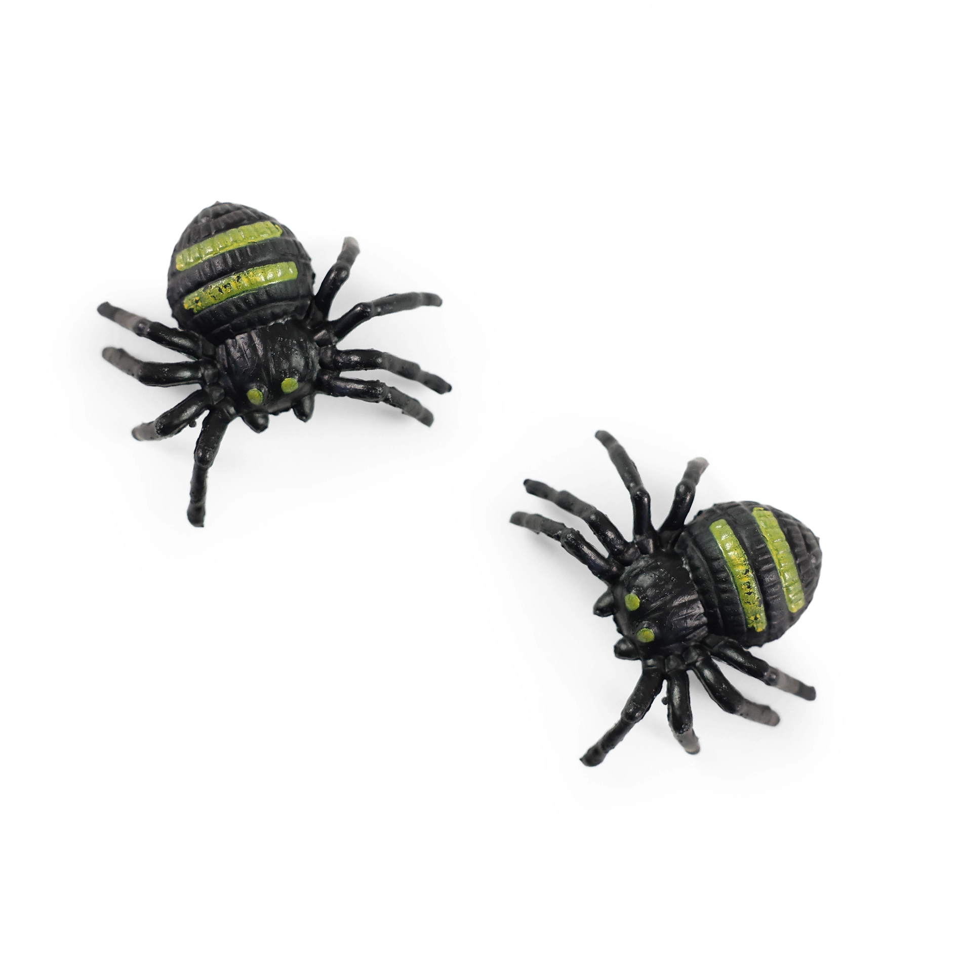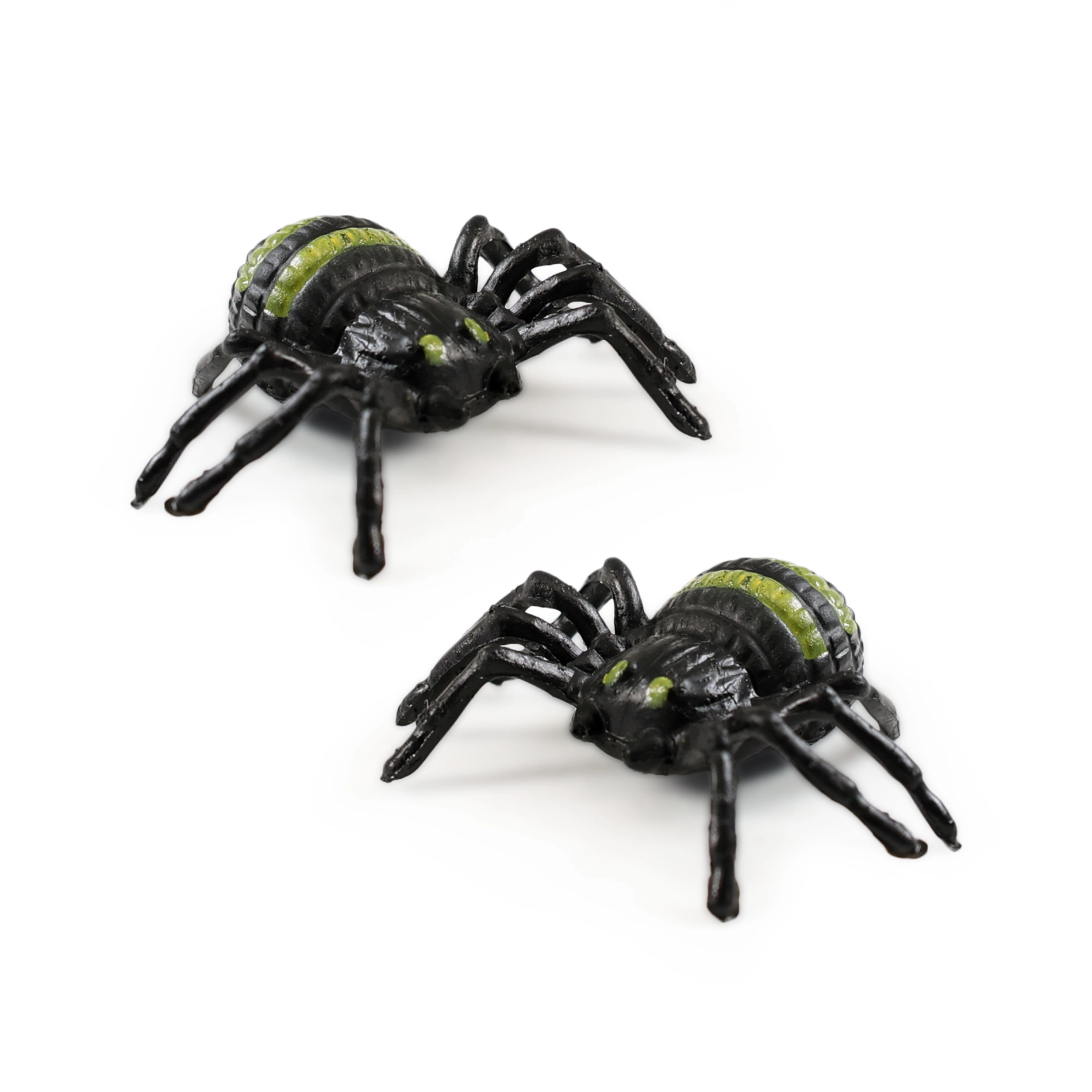 Два пластмасови паяка с черни тела и зелени ивици по гърба, идеални за декорация или аксесоари за Хелоуин.