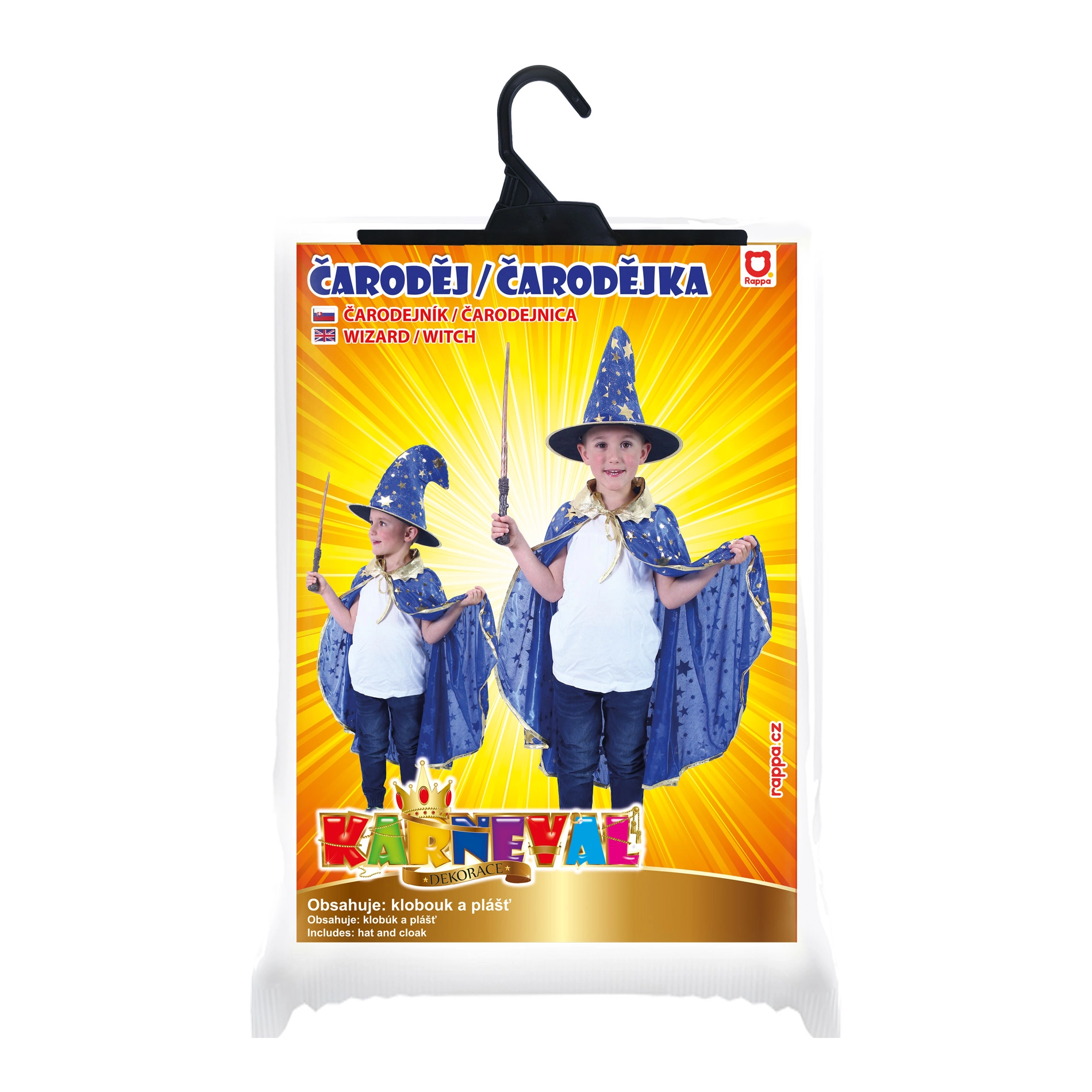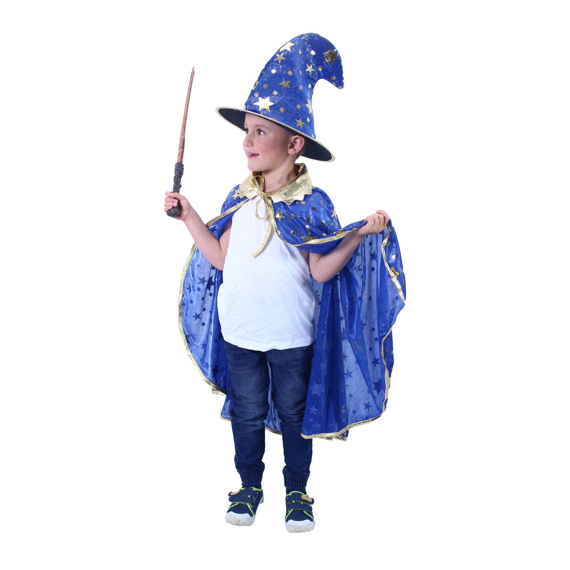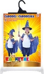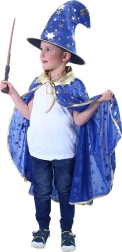 Този ексклузивен магьоснически сет гарантира, че на нито едно събитие няма да останете незабелязани! Синият плащ е украсен със златен кант и звездички, които добавят ефектност. Шапката перфектно подхожда на плаща и завършва цялостното излъчване. Идеален за Хелоуин или всеки тематичен карнавал.