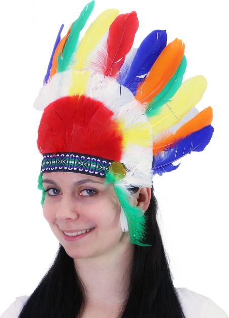 Стилна индианска лента за глава, украсена с цветни меки пера – перфектният аксесоар към костюм на индианец за карнавал или маскарад. Десенът може да се различава от показаното.