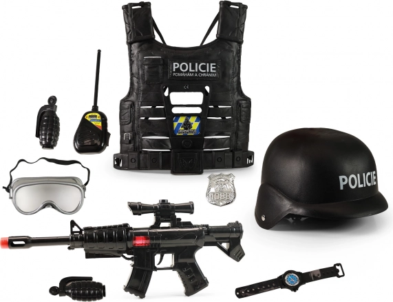 Стани герой от специалния отряд! Този детски полицейски комплект предлага полицейска жилетка с чешки надписи, пластмасов автомат и богат аксесоарен комплект за ролеви игри – каска, граната, уоки-токи, часовник, значка и очила. Лекият пластмасов материал и безопасната изработка гарантират забавление без притеснения у дома и навън.