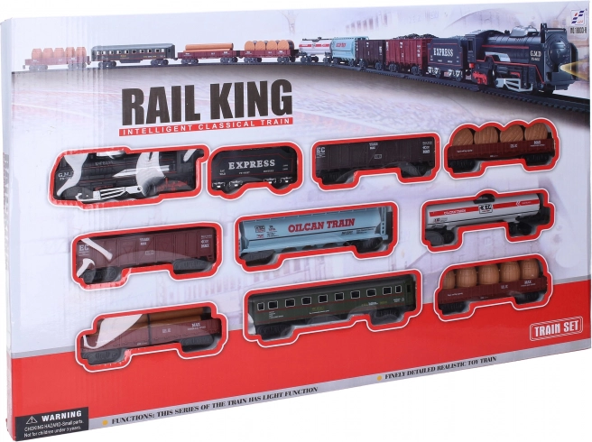 Насладете се на голям влаков комплект с размери 122 × 68 cm и реалистични звуци, които превръщат обикновената игра в истинско пътешествие. Локомотивът свети, комплектът предлага детайлна изработка и много товарни вагони за още по-голямо забавление.